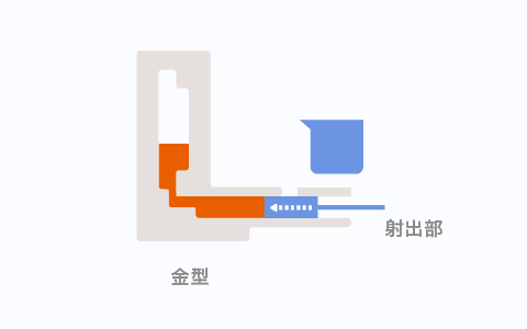 加熱して溶かした亜鉛、アルミニウム、マグネシウムを金型の中に充填し、金型内で冷却をして製品を成形します。生産性が高く複雑な形状の製品を作る事ができる鋳造方法の一つです。自動車のエンジンやトランスミッションのケース、アルミホイール、衣服などに用いるファスナーもダイカスト用金型で作られています。